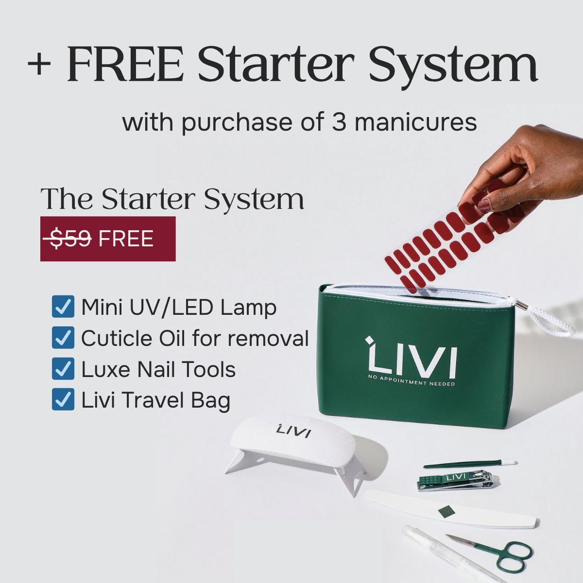 Pick 3 gel manicures, get A FREE STARTER SYSTEM($59 value)
